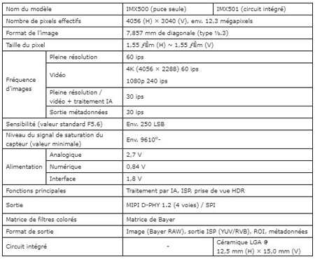 La puce de pixels est rétro-éclairée et dispose d’environ 12,3 mégapixels effectifs pour capturer des informations sur un grand angle de vue. En complément du circuit du capteur d’images classique, la puce logique est dotée d’un processeur de signal numérique (DSP) original de Sony dédié au traitement du signal par IA et de la mémoire pour le modèle d’IA. Cette configuration permet de se passer de processeurs haute performance ou de mémoire externe, et de créer des systèmes d’IA en périphérie du réseau.