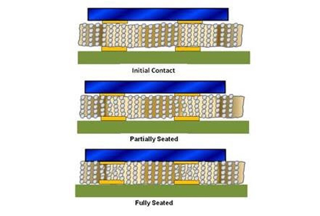 Quand ce film est compressé, entre 2 conducteurs, par exemple un composant et son circuit imprimé, le silicone se déforme laissant les colonnes de billes assurer le contact entre ces conducteurs avec des pas de 0.1 mm à 1.27 mm et plus.