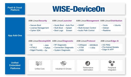 Advantech propose un cadre AIM (Allied, Industrial and Modular) pour applications Linux, qui accélère le développement logiciel grâce à un support souple et pérenne. Les services AIM-Linux proposent des plateformes avec SE embarqué vérifiées, ainsi que des applications et des SDK à vocation industrielle, parmi lesquels les utilisateurs trouveront facilement les outils logiciels embarqués dont ils ont besoin, et leur permettant de se concentrer sur le développement de leur logiciel d’application. Le module ROM-5620 profite aussi de WISE-DeviceOn pour embarquer des dispositifs automatisés de manière sécurisée, surveiller des dispositifs à distance, et effectuer des mises à jour OTA (sans connexion filaire).
