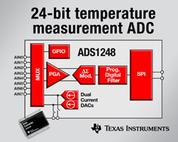 Texas Instruments Incorporated (TI) (NYSE : TXN) annonce le lancement d’une nouvelle famille de convertisseurs analogique-numérique 24bits. Destinés aux applications de mesure de la température, ces CAN allient faible bruit, ultra-faible consommation et haute intégration. Les modèles ADS1248 et ADS1247 intègrent deux convertisseurs numérique-analogique à sortie en courant appairés, une référence interne à faible dérive, un oscillateur, un capteur thermique, un dispositif de détection de claquage, ainsi que huit E/S à usage général.