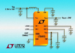La large gamme de tensions d’entrée du LT8415, de 2,5 V à 16 V, lui permet de fonctionner à partir d’un élément de batterie Li-ion jusqu’à des rails d’entrée de tension fixe de 12 V, générant en sortie des tensions jusqu’à 40 V. La tension de sortie peut être réglée de façon dynamique en pilotant la broche FBP par une tension externe. Le LT8415 peut fournir un courant moyen de 700 μA en sortie, à 34 V, à partir d’un élément de batterie Li-ion, ce qui le rend idéal pour les applications tel les relais MEM ou une alimentation de polarisation. Le composant utilise une technique de contrôle unique qui permet d’obtenir des rendements( inférieur à 210 mVcrête-à-crête ), sur une gamme étendue du courant de charge.