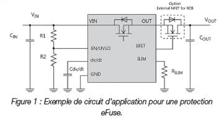 La résistance à l’état passant (RON) du commutateur intégré est un très respectable 28 mΩ, tandis que la pente de courant d’appel autorisée, et le verrouillage en cas de tension insuffisante, peuvent être ajustés à l’aide de composants externes. La surveillance de température interne assure également la protection, et quand la température atteint 160°C la sortie du dispositif est automatiquement coupée. Selon le modèle d’eFuse sélectionné, la protection peut être verrouillée et nécessitera alors une réinitialisation via la broche d’activation EN, ou l’alimentation peut être rétablie automatiquement une fois la température redescendue d’environ 20°C. L’écrêtage assuré en cas de surtension est fonction du dispositif eFuse sélectionné.