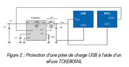 Un eFuse offre une protection idéale et compacte pour les chargeurs USB et les packs de batteries, en protégeant la prise de charge (Figure 2). Le TCKE805NL offre un ajustement optimal en assurant une protection à verrouillage ainsi qu’un écrêtage à 6,04 V en cas de surtension. Une résistance 75 kΩ connectée à la broche ILIM permet de limiter le courant à 1,5 A, tandis qu’un condensateur de 2 nF connecté à la broche dV/dT assure une rampe de démarrage de 4 ms. Des condensateurs de 1,0 μF en entrée et en sortie sur les broches VIN et OUT atténuent l’overshoot (surtension transitoire) et l’undershoot (sous-tension transitoire) lors de brusques variations du courant. Si nécessaire, un FET canal-N peut également être intégré pour protéger contre les courants inverses.
