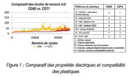 La performance électrique d’un lubrifiant de contact s’évalue généralement en mesurant la chute de tension mV sur les contacts/commutateurs pendant un nombre de cycles spécifique en général, sur plus de 20 000 cycles d’utilisation. La performance de divers lubrifiants de contact peut varier en fonction de la formule et de l’utilisation finale prévue. Par exemple, certains matériaux présentent une chute de tension mV faible et plus stable sur un plus grand nombre de cycles, mais en échange d’un compromis sur la compatibilité des plastiques, comme c’est illustré à la Figure 1. Dans d’autres cas, l’application peut exiger une consistance spéciale du lubrifiant de contact, combinée à de bonnes propriétés électriques. On pourrait choisir une graisse plus « dure » ou plus « rigide », qui ne soit pas déplacée par l’action mécanique du commutateur. Dans de tels cas, la pénétration d’un cône à différentes températures, ou des essais d’usure des lubrifiants, peut aider à la sélection du bon produit. À l’opposé, une graisse très molle ou une huile de contact pourrait être requise dans les applications où la force de contact est très faible ; il convient alors de tester l’action mécanique du commutateur avec une gamme de lubrifiants pour déterminer s’ils sont adaptés. Il faut donc bien prendre en compte toutes les exigences électriques, la compatibilité des matériaux et les influences environnementales afin de choisir le lubrifiant adapté.