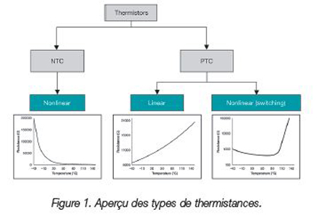 Les thermistances CTN existent depuis plusieurs décennies. Grâce à leur prix abordable, elles se sont imposées comme composant par défaut pour ce type de capteurs de température. Cependant, les thermistances linéaires gagnent en popularité en raison des avantages qu’elles offrent. Les thermistances linéaires en silicium sont parfois appelées « silistance », ou capteurs KTY. Elles font partie de la famille des thermistances CTP, car leur résistance augmente avec la température. Les thermistances CTP non linéaires, quant à elles, sont généralement utilisées dans des applications de limitation de courant en raison de l’augmentation rapide de leur valeur de résistance à partir d’une certaine température, appelée température de Curie. À cause de cette caractéristique, on peut parler de « thermistances CTP à point de basculement ».