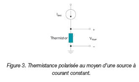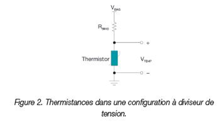 Une manière simple et peu coûteuse d’alimenter une thermistance en courant polarisé consiste à utiliser une source de tension constante et un circuit diviseur de tension (voir Figure 2). À mesure que la température change, on observe une modification de la chute de tension (VTEMP) au niveau de la thermistance. Quand on conçoit un système avec une source de tension, il est toujours intéressant d’adopter une approche ratiométrique, qui peut permettre d’annuler l’effet de variation de l’alimentation.