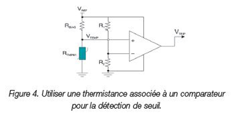 Autre circuit de polarisation couramment utilisé : une source à courant constant (voir Figure 3), qui permet de mieux maîtriser la sensibilité de VTEMP afin d’améliorer la précision du système et d’utiliser pleinement toute la plage de valeurs des convertisseurs analogiques-numériques (CAN). La tension VTEMP est généralement injectée directement dans un CAN ou acheminée via un comparateur afin d’assurer des fonctions de détection de seuil de base (voir Figure 4). La tension en sortie du comparateur reste faible, jusqu’à ce que VTEMP dépasse le seuil de tension défini par R1 et R2. Lorsqu’elle augmente, le comparateur émet un signal de surchauffe. Afin de maintenir ce signal d’alerte jusqu’à ce que la température revienne à la valeur spécifiée (en tenant compte du phénomène d’hystérésis), on peut utiliser un comparateur à hystérésis ou intégrer au système des résistances de rétroaction.