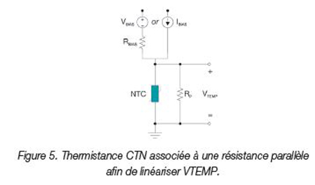 Il peut être intéressant pour vous d’avoir une réponse en tension VTEMP linéaire au niveau de la thermistance, car cela facilite l’implémentation du logiciel et limite les erreurs dues aux variations. Dans un cas classique, il faut combiner plusieurs thermistances CTN à des résistances fixes pour linéariser la réponse en tension sur toute la plage de températures. A minima, si vous utilisez une thermistance CTN, vous devrez ajouter une résistance parallèle (voir Figure 5).