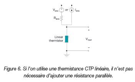 Les thermistances CTP linéaires, elles, fournissent une tension VTEMP intrinsèquement linéaire, puisqu’elles affichent une courbe R-T linéaire ; il n’est pas nécessaire d’ajouter des composants (voir Figure 6).