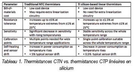 Comparées aux thermistances CTN classiques, les thermistances linéaires en silicium présentent bien des avantages. Il en existe de nombreux formats. Or, l’un des principaux obstacles à leur adoption était leur prix, nettement plus élevé que celui des thermistances CTN. Texas Instruments élimine cet obstacle en proposant une gamme de thermistances linéaires en silicium aussi compactes que des thermistances CTN, à un tarif comparable. Le Tableau 1 compare des thermistances CTN classiques aux thermistances linéaires en silicium de TI. Les performances des thermistances linéaires en silicium se révèlent précieuses sur un large éventail d’applications industrielles et automobiles. Pour en savoir plus sur la gamme proposée par TI, consultez la page dédiée aux thermistances sur le site de TI.
