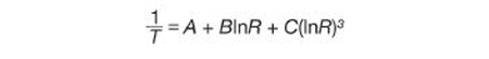 Autre méthode de conversion, mieux adaptée aux applications conservant un historique des mesures : une équation d’ajustement de courbe représentant de manière précise la caractéristique R-T du composant. Pour les thermistances CTN, on se base souvent sur la relation de Steinhart–Hart (Équation 1) :