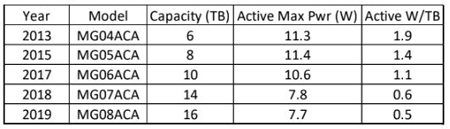 Les disques durs (HDD) offrent de loin le coût le plus bas par unité de stockage en ligne. Donc bien sûr il faut les privilégier. En ce qui concerne le ratio $/To, les modèles haut de gamme actuels sont tous similaires pour les disques de 12 To, 14 To ou 16 To. Par conséquent, il n’y a aucune préférence lors de l’optimisation pour $/ To. Cependant, lorsque vous utilisez des disques durs de 16 To, moins de disques sont nécessaires pour une capacité donnée qu’avec 12To ou 14 To. Cela a un impact sur un autre critère d’optimisation : moins de disques prennent moins d’espace, à des capacités plus élevées, la consummation d’énergie par capacité de stockage sera également considérablement plus faible, comme le montre le tableau 1.