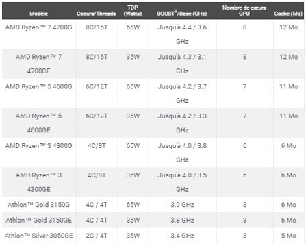Offrant réactivité et visuels saisissants grâce au circuit Radeon inclus, les processeurs AMD de la gamme Ryzen 4000-G prennent place au cœur de systèmes préassemblés et offrent des niveaux de performance plus que satisfaisants sans requérir à une carte graphique additionnelle. Qui plus est, la gamme AMD Athlon™ 3000 G-Series propose réactivité, performances et fonctionnalités au goût du jour pour des PC entrée de gamme. Ces derniers bénéficient donc de l’architecture « Zen » normalement issue des processeurs AMD Ryzen plus élaborés, tout en embarquant un circuit graphique Radeon.