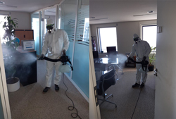 Le procédé de nébulisation s’est effectué dans les locaux vides avec un temps d’inoccupation total de 3h et n’a nécessité que très peu de produit avec une efficacité maximale pour obtenir un résultat optimal. Lors de leur nébulisation, les particules désinfectantes se répandent absolument partout dans les bureaux, pour une désinfection de l’ensemble des surfaces du lieu. La désinfection par nébulisation ne nécessite aucun rinçage, ne tâche pas, est sans alcool et sans chlore, non corrosive et non irritante.