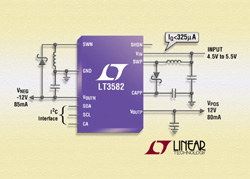 En alternative, ces paramètres peuvent être fixés à la fabrication et rendus permanents via la mémoire non volatile OTP (programmable une seule fois) intégrée. La tension de sortie positive du LT3582 peut être réglée entre 3,2 V et 12,775 V par pas de 25 mV, alors que la tension de sortie négative peut être réglée entre – 1,2 V et – 13,95 V par pas de 50 mV. Le LT3582-5 et le LT3582-12 sont pré-configurés avec des tensions de sortie respectives de ± 5 V et ± 12 V, utiles dans de nombreuses applications de conditionnement du signal.