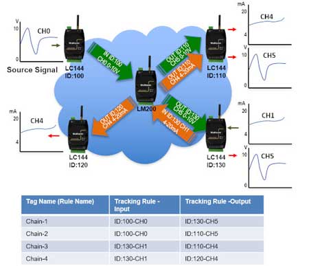 Le LM200 LoRa Master reçoit et envoie plusieurs entrées, sorties analogiques ou données Modbus RS485 du nœud d’extrémité LoRa LC144. Différentes chaînes de règles peuvent être configurées dans le LM200 pour coupler ou mettre en miroir deux contrôleurs LC144, ou pour regrouper plusieurs nœuds LC144 pour le contrôle logique. Un LM200 peut connecter jusqu’à 250 nœuds LC100 LoRa et la distance sans fil LoRa peut atteindre jusqu’à 6 km.