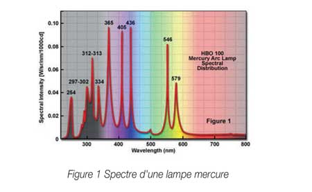 Le rendement d’une lampe mercure est de l’ordre de 5%, c’est-à-dire que pour 100W consommés, seulement 5W sont transformés en puissance optique. De plus, la lampe mercure ayant un spectre assez large, seule une partie des longueurs d’ondes émises sont utiles pour la réaction de polymérisation UV. Les longueurs d’ondes du visible émises ne servent pas à la polymérisation. 70% de la puissance émise sont des infra rouges, c’est de « l’émission directe de chaleur », qui peut fragiliser certains composants électroniques ou des pièces plastiques sensibles.