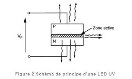 Le principe de fonctionnement est le suivant : un courant va traverser les matériaux semi-conducteurs. Les électrons passant d’une jonction (N et P) à une autre, vont perdre de l’énergie ce qui va créer un photon (zone active) et donc émettre de la lumière. Pour cette technologie, c’est le choix des matériaux semi-conducteurs qui va déterminer la longueur d’onde émise par la LED. Une lampe UV LED, est donc un système électronique qui inclut plusieurs LED (parfois des milliers) selon la taille de la fenêtre d’émission et la puissance optique que l’on souhaite obtenir. Par exemple, une lampe UV LED 395nm signifie que toutes les LED UV utilisées sont les mêmes et que leur propriété principale est d’avoir leur pic d’émission à 395nm.