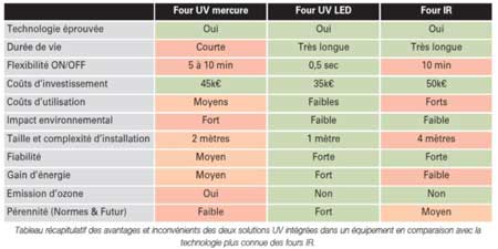 La puissance d’une lampe mercure décroit dans le temps en fonction de son utilisation, cela implique qu’il faut régulièrement contrôler sa puissance pour être sûr que la dose en millijoules est suffisante pour assurer une polymérisation correcte. C’est une contrainte à prendre en compte dans le choix de la technologie. Le prix d’une lampe mercure est plutôt attractif (quelques centaines d’euros), mais ce système nécessite beaucoup de maintenance et l’industriel doit avoir à l’esprit qu’il faut remplacer les lampes assez fréquemment. Il faut aussi tenir compte des normes REACH et autres normes environnementales qui ne prévoient pas de pérenniser cette technologie. De plus, l’intégration d’une lampe mercure dans un équipement nécessite un système d’extraction et une gestion de la température qui peut être vite contraignante.