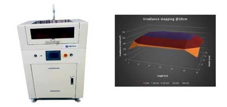 Le spectre d’un système UV LED est souvent très étroit (par exemple, un pic principal à 395nm de plus ou moins 10nm), souvent en UVA. Ce sont les UV les moins dangereux, mais du fait de leur puissance, ils restent dangereux. Il n’y a pas de création d’ozone, car il n’y a pas de présence d’UVC. La contrainte de chaleur émise est aussi moins importante car il n’y a pas d’IR émis par ce type de système à LED UV. Le rendement d’un système UV LED est de l’ordre de 30%, cela signifie que pour 100W consommés, 30W sont de la puissance optique, normalement utilisée directement pour la polymérisation UV, car la chimie est adaptée à la longueur d’onde émise par la lampe LED. Pour mesurer un système UV LED, il suffit d’avoir un radiomètre calibré dans la longueur d’onde émise par le système UV LED. Ce qui est mesuré, est ce qui directement utile au processus de polymérisation. Les mesures sont répétables et stables. Le système UV LED ne perd pas ou très peu d’irradiance sur la durée. C’est un gage de sécurité.