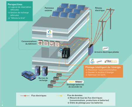 Le projet PhARRE a d’abord consisté en l’installation en toiture d’un système de production photovoltaïque de 200 m2 de panneaux (39,5 kWc). Le choix d’auto-consommer l’électricité produite directement dans le bâtiment s’est imposé pour assurer une diminution de l’impact de la consommation énergétique du bâtiment sur le réseau. Le siège abritant essentiellement des bureaux, la consommation est majoritairement en journée c’est-à-dire au moment où la production d’énergie photovoltaïque est possible. Un surplus de production peut apparaître dans la journée mais aussi et surtout pendant les week-ends et les jours fériés. Pour cette raison et afin d’optimiser la quantité d’énergie électrique autoconsommée, le SyDEV a eu recours à la mise en place d’un système de stockage. L’objectif : conserver ces surplus et les réutiliser à des moments plus appropriés, notamment pour alimenter en besoin de recharge sa flotte de véhicules électriques composé d’une dizaine de voitures.