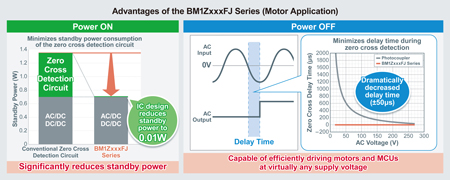 La série BM1ZxxxFJ réduit la consommation de courant du circuit de passage par zéro à seulement 0,01 W tout en alimentant continuellement le système. De plus, l’erreur de temps de temporisation (variable selon la tension du courant alternatif) qui existe avec les circuits de détection de passage par zéro équipés de photocoupleurs conventionnels est limitée à ±50 μs ou moins. Cela permet une gestion efficace des moteurs même avec les différentes tensions d’approvisionnement en courant alternatif utilisées dans divers pays et régions ainsi que des MCU. Dans le même temps, l’élimination du besoin d’un photocoupleur contribue à une plus grande fiabilité de l’application en réduisant les risques liés à la dégradation basée sur l’âge.
