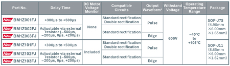 Les formes d’ondes d’impulsion et de flanc utilisées dans les spécifications des appareils électroménagers sont toutes deux prises en charge par la série BM1ZxxxFJ, ce qui élimine la nécessité de modifications du logiciel lors du remplacement des circuits conventionnels de détection de passage par zéro. ROHM propose six modèles pour assurer la compatibilité avec une large gamme d’appareils électroménagers.