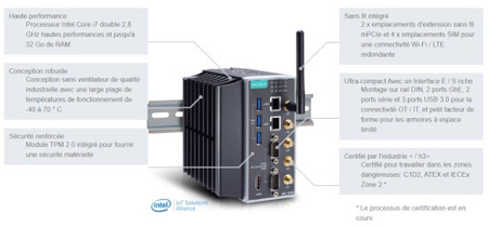 Les interfaces d’extension peuvent incorporer des accélérateurs matériels, tels que des VPU, et prendre en charge la boîte à outils Intel OpenVINO pour le développement d’applications AIoT. Conçus sur la base de la vaste expertise de Moxa dans la construction de plates-formes informatiques robustes, les ordinateurs peuvent fonctionner sur une large plage de températures de fonctionnement de -40 à 70 °C et sont certifiés C1D2 / ATEX Zone 2 pour les déploiements dans des environnements extérieurs et dangereux. En outre, ces ordinateurs ultra-compacts sans ventilateur font partie des plus petits ordinateurs industriels au monde équipés de processeurs Intel Core i7, ce qui facilite leur installation sur le terrain dans de petites armoires.