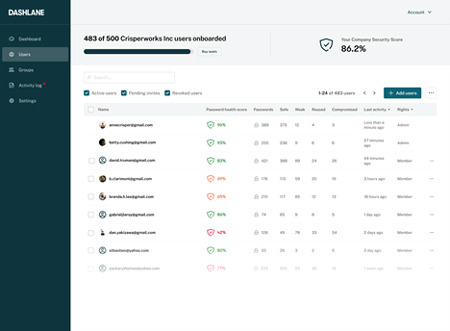 Les administrateurs de comptes Team et Business peuvent accéder au tout nouveau tableau de bord d’analyse des mots de passe par le biais de leur console d’administration (une exclusivité Dashlane). Cette dernière fournit aux administrateurs des données exploitables sur les scores de sécurité des employés, qu’ils peuvent ainsi accompagner pour modifier tout mot de passe faible, réutilisé ou compromis. Grâce à cet outil de reporting historique, les administrateurs sont en mesure d’évaluer avec précision l’impact des mesures de sécurité prises au fil du temps.