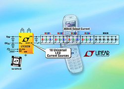 Le circuit intégré possède 18 sources de courant de DEL, individuellement configurables, pour une grande souplesse dans la programmation de plusieurs écrans. Les intensités des écrans sont fixées par une référence de courant interne de précision. Les sources de courant universelles sont à contrôle numérique, avec réglage indépendant de la luminosité, du clignotement, et contrôle de la gradation, programmables par une interface série deux fils I2C ; le LTC3220 et le LTC3220-1 ont chacun une adresse I2C unique. La gamme de tensions d’entrée des LTC3220/-1, de 2,9 V à 5,5 V, est optimisée pour les applications alimentées sur un élément de batterie Li-ion / polymère. Les rendements, quand le circuit est alimenté sur un élément de batterie au Lithium (3,6 V nominal), atteignent 91%, avec un courant de repos de seulement 500 µA, ce qui augmente l’autonomie sur batterie. De plus, la commutation à vitesse de montée limitée réduit le bruit de conduction et de radiation (IEM : interférences électromagnétiques).