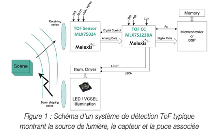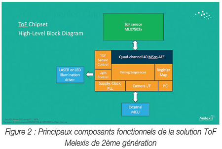 Le chipset Melexis de deuxième génération comprend un capteur ToF dédié et un circuit compagnon qui commande le système et s’interface avec le microcontrôleur externe ou le sérialiseur.