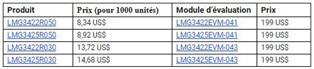 Les quatre nouveaux transistors FET en nitrure de gallium 600 V industriels sont disponibles dès à présent en version de préproduction, exclusivement sur TI.com, dans un boîtier QFN (quad flat no-lead) de 12 x 12 mm. Les prix sont indiqués dans le tableau ci-dessous. TI prévoit un passage en production au cours du premier trimestre 2021. Les modules d’évaluation sont proposés sur TI.com à partir de 199 US$. Le site offre différentes options de paiement, de ligne de crédit et d’expédition fiable et rapide.