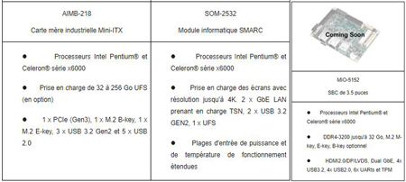 Advantech, l’un des principaux fournisseurs de solutions embarquées pour l’industrie A-IoT, est heureuse d’annoncer trois nouvelles plates-formes informatiques embarquées dotées des processeurs Intel Atom® série x6000 et Intel® Pentium® et Celeron® série N et J. Ces plates-formes l’ordinateur SOM-2532 d’Advantech sur module, la carte mère industrielle AIMB-218 et l’ordinateur à carte unique de 3,5 pouces MIO-5152 sont dotées des derniers processeurs Intel® et de la solution d’exploitation et de gestion des périphériques IoT Advantech Wise-DeviceOn.