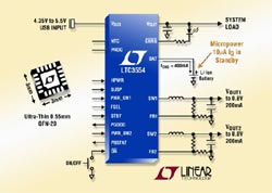 Le LTC3554 est compatible avec des tensions d’entrée jusqu’à 5,5 V (transitoire de 7 V max. absolu, pour une robustesse accrue). Le fonctionnement "marche immédiate" assure l’alimentation de la charge même si la batterie est complètement déchargée. Le fonctionnement autonome permet de simplifier la conception, en supprimant le besoin d’un microprocesseur externe pour la gestion de la fin de charge. La diode idéale intégrée de 240 mohms assure un transfert d’énergie à faibles pertes, lorsque le courant d’entrée est limité ou absent.
