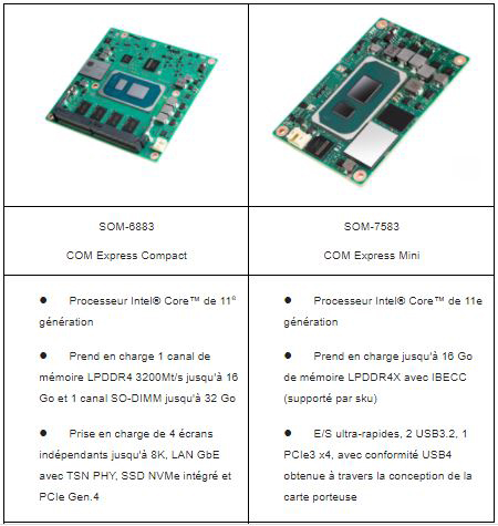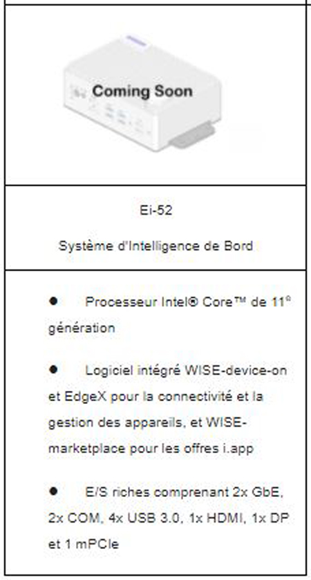 Ces solutions, qui incluent les COM (computer on module) SOM-7583 et SOM-6883, les single board computers SBC MIO-5375 et MIO-2375 et le système d’intelligence de bord Ei-52, sont toutes équipées des derniers processeurs d’Intel® et de la solution de gestion des appareils IoT WISE-DeviceOn d’Advantech.