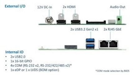 Nombreux E/S et emplacements d’extension système : 4 ports COM, 4 ports USB, 2 ports HDMI, 2 ports GbE LAN, un GPIO 16 bits, et 3 ports d’extension M.2.