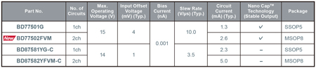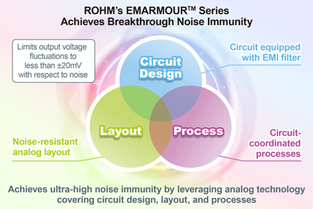 Pour atténuer les problèmes de bruit courants avec les amplificateurs opérationnels conventionnels, ROHM a développé la série EMARMOUR™ présentant des amplificateurs opérationnels très tolérants au bruit. Le premier membre novateur de la famille EMARMOUR était l’amplificateur opérationnel CMOS grande vitesse à un canal BD77501G tirant parti de la technologie Nano Cap™ pour prévenir les oscillations causées par la capacitance de charge. Ce produit a reçu un bon accueil de nombreux ingénieurs dans de nombreux domaines et régions, et notre dernière version 2 canaux a été développée pour répondre aux exigences croissantes du marché.