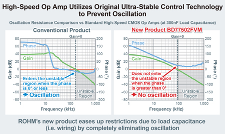 Le dernier BD77502FVM intègre deux appareils à amplificateur opérationnel prévenant les oscillations en fournissant une amplification à grande vitesse avec jusqu’à 10 V/µs de vitesse de balayage et une immunité inédite aux interférences électromagnétiques (IEM). La tension de sortie sur l’ensemble de la bande de fréquences de bruit est limitée à moins de ± 20 mV, soit 10 fois moins qu’un amplificateur opérationnel conventionnel. L’amplification du signal à grande vitesse est maintenant réalisable sans être affectée par le bruit externe ou la capacitance de charge en cas d’utilisation dans les appareils émettant de petits signaux tels que les capteurs, améliorant ainsi la fiabilité tout en simplifiant les conceptions des circuits.
