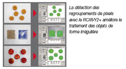 Le système RCXiVY2 propose également une approche innovante pour la reconnaissance des objets, qui est jusqu’à 10 fois plus rapide que la détection des contours traditionnelle dans les systèmes de vision automatisés. Cette technique de « détection des regroupements de pixels » applique des critères seuils aux images en niveaux de gris de la caméra, en tenant compte des variations de lumière et d’ombre, puis utilise un traitement codé binaire pour les convertir en gradations en noir et blanc. Cette approche améliore la prise, la reconnaissance de présence et le comptage à haute vitesse de pièces multiples. La détection des regroupements de pixels est particulièrement efficace lorsque les objets ont une forme irrégulière, comme les denrées alimentaires et les vêtements, et élargit donc le champ d’application de la vision robotique.