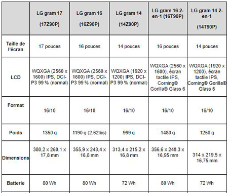 La gamme diversifiée comprend cinq nouveaux modèles : LG gram 17 (modèle 17Z90P), LG gram 16 (modèle 16Z90P), LG gram 14 (modèle14Z90P), LG gram 2-en-1 16 (modèle16T90P) et LG gram 2-en-1 14 (modèle 14T90P), tous dotés d’écrans de format 16/10e pour optimiser l’efficacité du travail. Arborant une grande surface de travail, les modèles LG gram affichent davantage d’informations en une seule fois. Le clavier et le pavé tactile ont également été agrandis pour faciliter et accélérer la saisie sans réduire la portabilité de ces ordinateurs compacts.