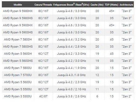 S’appuyant sur le leadership de la précédente génération de processeurs mobiles, la gamme Ryzen 5000 Series se compose de processeurs orientés performance avec les H-Series d’un côté et les processeurs ultra-mobiles U-Series de l’autre. Au sommet de la gamme, les processeurs AMD Ryzen 5000 H-Series Mobile offrent des expériences vidéoludiques impressionnantes, en combinant des performances inégalées et une autonomie exceptionnelle, le tout avec un maximum de 8 cœurs, 16 threads et l’architecture AMD « Zen 3 ».