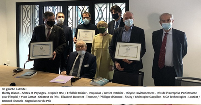 Les deux autres prix, le « Trophée RSE du Jury » et le « Prix Entreprise Performante pour l’emploi » étaient remis respectivement à Arbres et Paysages et à Tricycle Environnement.
