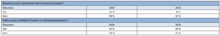Non seulement les Français sont plus de 92 % à ne pas montrer leur ennui ou leur désœuvrement (90 % en 2019) mais qui plus est, ils sont 69 % à faire croire aux autres que leur travail est tout-à-fait passionnant (62 % en 2019).