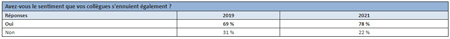 A la question « avez-vous le sentiment que vos collègues s’ennuient également ? », plus de 78 % des Français répondent par l’affirmative soit 9 points de plus qu’en 2019.