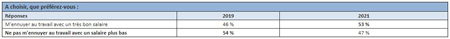 Alors que plus de 54 % des Français déclaraient il y a deux ans préférer avoir un salaire plus bas avec un travail plus intéressant, le choix est bien différent en 2021. En effet, près de 53 % des Français préfèrent s’ennuyer au boulot s’ils gagnent plus d’argent.