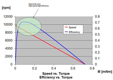 Par rapport à un moteur CC sans fer, le moteur BLDC aura un rendement inférieur en raison des pertes de fer, et un couple plus faible pour une unité de même taille. Une façon de compenser les pertes consiste à utiliser le moteur BLDC à des vitesses plus élevées, en tenant compte de ce paramètre lors du choix d’un réducteur.