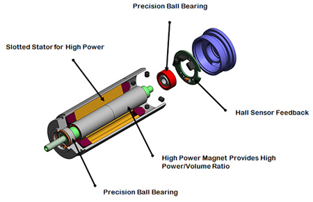 Dans un moteur BLDC, les bobines sont fixes et l’aimant fait partie du rotor. La commutation dans les bobines est électronique. Habituellement, le tube externe qui ferme le champ magnétique de l’aimant est fixe, ce qui génère des pertes de fer pendant la rotation de l’aimant. Dans les applications où l’inertie n’est pas critique, le tube et l’aimant peuvent tourner ensemble, ce qui élimine les pertes de fer.