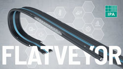 Le Flatveyor est un système de câble plat conforme pour salle blanche Classe ISO 2 qui peut par exemple être utilisé lors de la fabrication de sachets alimentaires ou dans des systèmes de tri de laboratoires. La vaste gamme de température comprise entre -10 et +80°C élargit qui plus est le domaine d’utilisation. Les éléments de soutien internes permettent des courses pouvant aller jusqu’à trois mètres et des vitesses de 2 mètres par seconde maximum. Les éléments de soutien servent de guides fiables qui peuvent se déplacer le long du rayon de flexion prévu dans une direction où les câbles et les tuyaux sont guidés de manière stable. Pour un fonctionnement silencieux, le système se déplace le long du rayon de flexion minimum des câbles alors qu’un petit pas de la chaîne réduit les émissions sonores et la vibration en fonctionnement. Il en résulte ainsi un niveau sonore inférieur à 38 dB (A). La structure indépendante empêche une rupture des câbles et des tuyaux. La construction est particulièrement compacte et légère ; le système peut être sans problème intégré dans des installations. Cette solution permet de réduire simplement les émissions sonores et la production de poussière dans des salles blanches et contribue ainsi à une baisse des frais totaux.