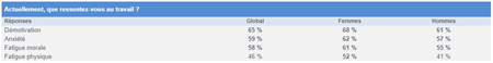 Sans surprise, les français ne sont pas au top de leur forme actuellement, mais dans un état général très morose qui semble plus fort encore chez les femmes. En effet, 68 % des femmes et 61 % des hommes se disent démotivés, 62 % des femmes et 57 % des hommes anxieux et 61 % des femmes contre 55 % des hommes très fatigués moralement. En revanche, physiquement, seulement les femmes (52 %) se sentent plus fatiguées que les hommes (41 %).