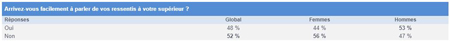 La transparence sur cet état global est difficile à exprimer sur le lieu du travail. Ainsi, 53 % des hommes déclarent qu’ils arrivent facilement à parler de leur ressenti à leur supérieur alors que les femmes ne sont que 44 % à y parvenir.